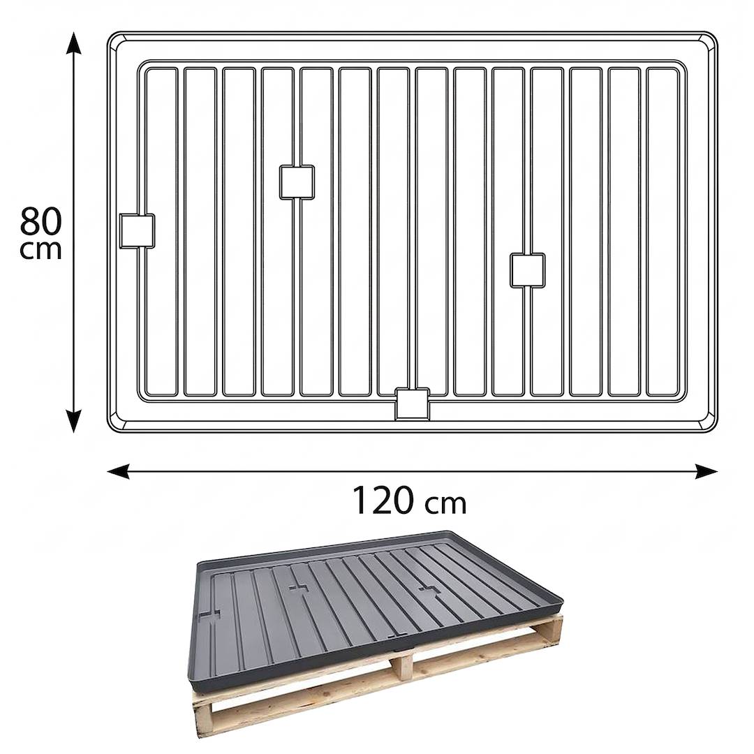 Indem Sie Ihre Paletten mit dieser Wanne ausstatten, können Sie Pflanzen und Blumen bewässern, ohne den Boden nass zu machen, und halten so Ihre Anlagen trocken, sauber, organisiert und sicher.