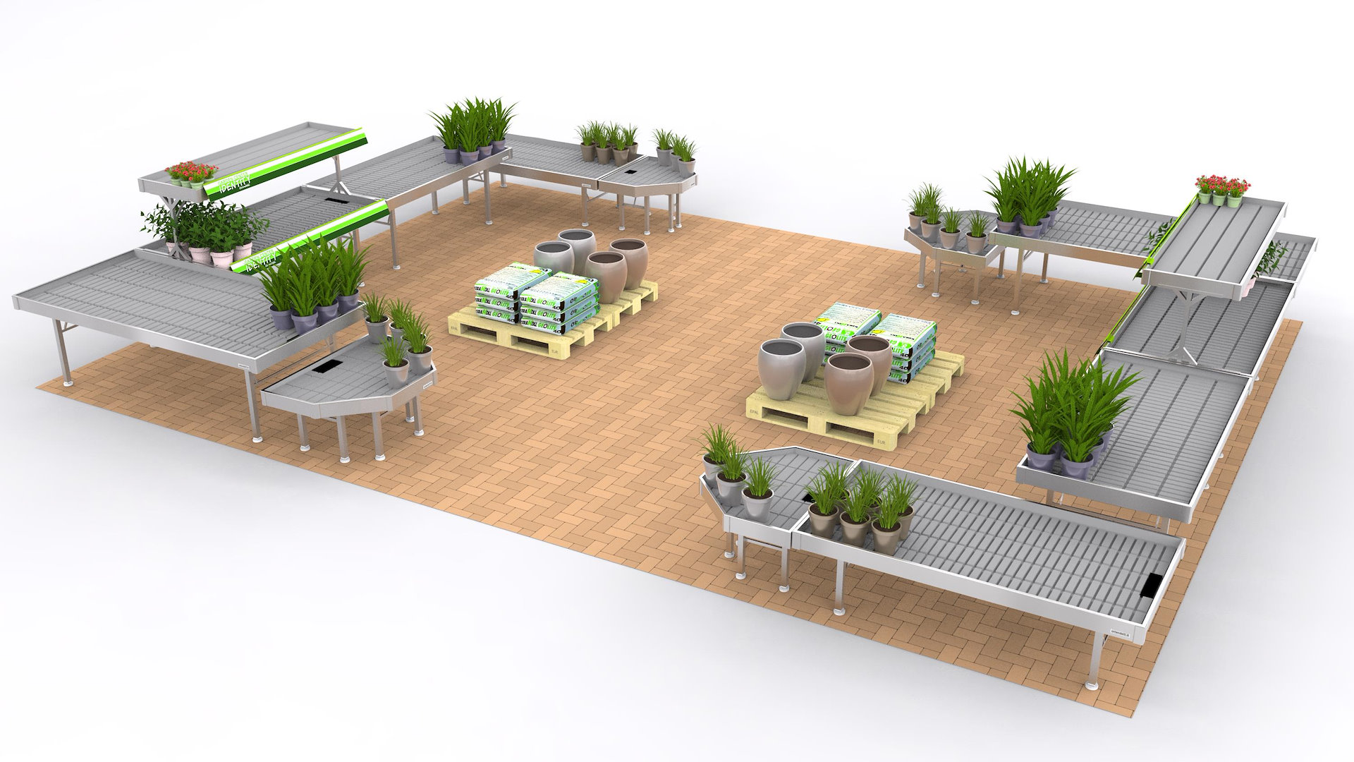 Das Ausstellungsset so strukturiert ermöglicht strategisch an dem Verkauf von Pflanzen und Blumen, ergänzenden Produkte wie Blumenerde, Töpfe und Düngemittel, zu kombinieren.