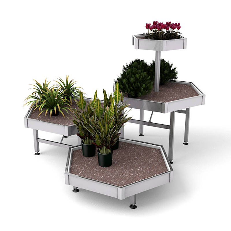 Die sechseckige Tische wurden mit drei verschiedenen Höhen (350-550-750 mm) und einem Doppeltisch erstellt, so kann man Ausstellungsspiele auch in der Höhe schaffen, aber vor allem für eine richtige Ausstellung aller Pflanzensorten von der niedrigsten bis der höchsten.